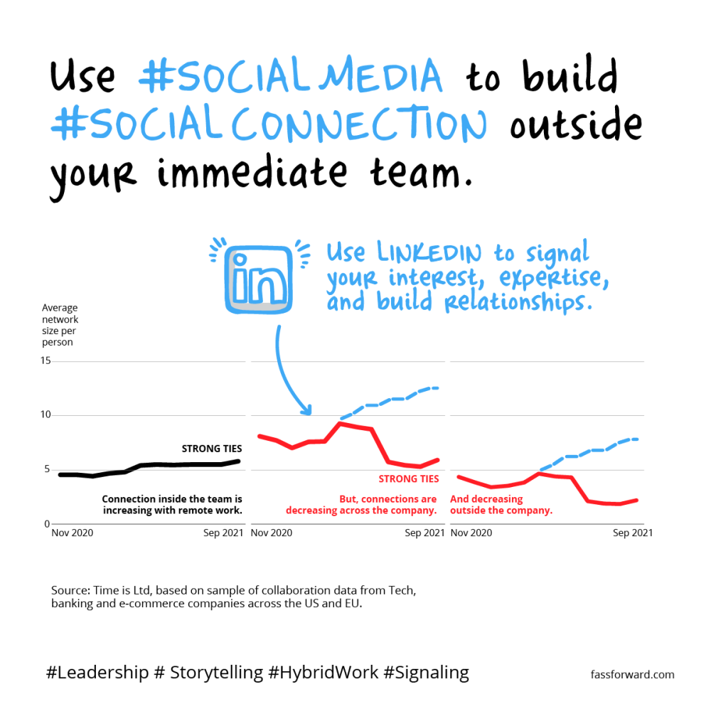 Jaime Teevan, Chief Scientist at Microsoft, said of remote work, “[it] caused a shift to asynchronous communication and made people’s collaboration networks more siloed.” — while close team connections strengthen, social connections across teams, and outside the company, shrink. Not good, when most get our work done with, or through other people. As a professional forum, LinkedIn is a way to share ideas, learn, and make new connections.